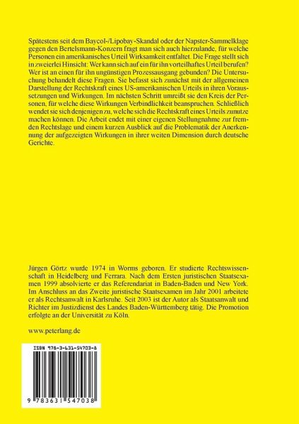 Spätestens seit dem Baycol-/Lipobay-Skandal oder der Napster-Sammelklage gegen den Bertelsmann-Konzern fragt man sich auch hierzulande, für welche Personen ein amerikanisches Urteil Wirksamkeit entfaltet. Die Frage stellt sich in zweierlei Hinsicht: Wer kann sich auf ein für ihn vorteilhaftes Urteil berufen? Wer ist an einen für ihn ungünstigen Prozessausgang gebunden? Die Untersuchung behandelt diese Fragen. Sie befasst sich zunächst mit der allgemeinen Darstellung der Rechtskraft eines US-amerikanischen Urteils in ihren Voraussetzungen und Wirkungen. Im nächsten Schritt umreißt sie den Kreis der Personen, für welche diese Wirkungen Verbindlichkeit beanspruchen. Schließlich wendet sie sich denjenigen zu, welche sich die Rechtskraft eines Urteils zunutze machen können. Die Arbeit endet mit einer eigenen Stellungnahme zur fremden Rechtslage und einem kurzen Ausblick auf die Problematik der Anerkennung der aufgezeigten Wirkungen in ihrer weiten Dimension durch deutsche Gerichte.