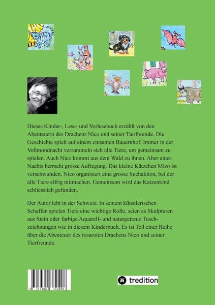 Ein Bilder-, Lese- und Vorlesebuch mit dem rosaroten Drachen Nico und seinen Tierfreunden. In der Vollmondnacht versammeln sich jeweils alle Tiere auf einem Bauernhof um gemeinsam zu spielen. Aber eines Nachts herrscht grosse Aufregung. Das kleine Katzenkind ist verschwunden. Nico organisiert eine grosse Suchaktion. Alle Tiere des Hofes machen eifrig mit. Gemeinsam wird das Kätzchen schliesslich wieder gefunden und gerettet.