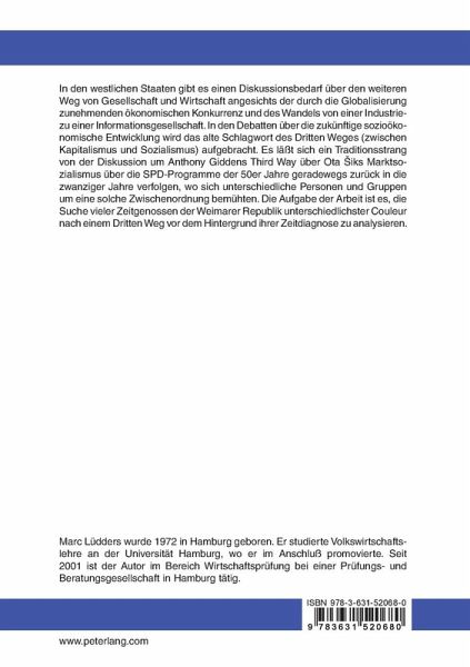 In den westlichen Staaten gibt es einen Diskussionsbedarf über den weiteren Weg von Gesellschaft und Wirtschaft angesichts der durch die Globalisierung zunehmenden ökonomischen Konkurrenz und des Wandels von einer Industrie- zu einer Informationsgesellschaft. In den Debatten über die zukünftige sozioökonomische Entwicklung wird das alte Schlagwort des Dritten Weges (zwischen Kapitalismus und Sozialismus) aufgebracht. Es läßt sich ein Traditionsstrang von der Diskussion um Anthony Giddens Third Way über Ota Siks Marktsozialismus über die SPD-Programme der 50er Jahre geradewegs zurück in die zwanziger Jahre verfolgen, wo sich unterschiedliche Personen und Gruppen um eine solche Zwischenordnung bemühten. Die Aufgabe der Arbeit ist es, die Suche vieler Zeitgenossen der Weimarer Republik unterschiedlichster Couleur nach einem Dritten Weg vor dem Hintergrund ihrer Zeitdiagnose zu analysieren.