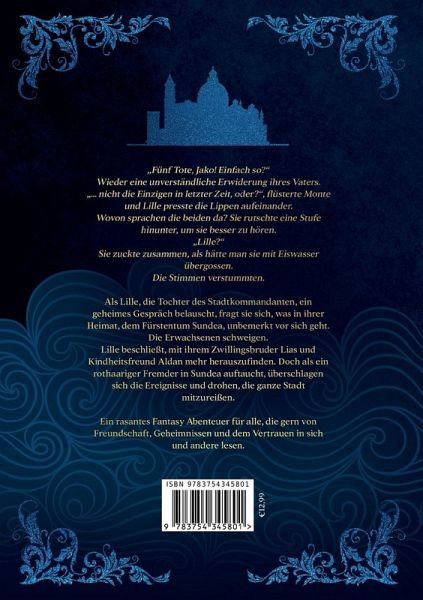 "Fünf Tote, Jako! Einfach so?"Wieder eine unverständliche Erwiderung ihres Vaters."... nicht die Einzigen in letzter Zeit, oder?", flüsterte Monte und Lille presste die Lippen aufeinander.Wovon sprachen die beiden da? Sie rutschte eine Stufe hinunter, um sie besser zu hören."Lille?"Sie zuckte zusammen, als hätte man sie mit Eiswasser übergossen.Die Stimmen verstummten.Als Lille, die Tochter des Stadtkommandanten, ein geheimes Gespräch belauscht, fragt sie sich, was in ihrer Heimat, dem Fürstentum Sundea, unbemerkt vor sich geht. Die Erwachsenen schweigen.Lille beschließt, mit ihrem Zwillingsbruder Lias und Kindheitsfreund Aldan mehr herauszufinden. Doch als ein rothaariger Fremder in Sundea auftaucht, überschlagen sich die Ereignisse und drohen, die ganze Stadt mitzureißen.Ein rasantes Fantasy Abenteuer für alle, die gern von Freundschaft, Geheimnissen und dem Vertrauen in sich und andere lesen.