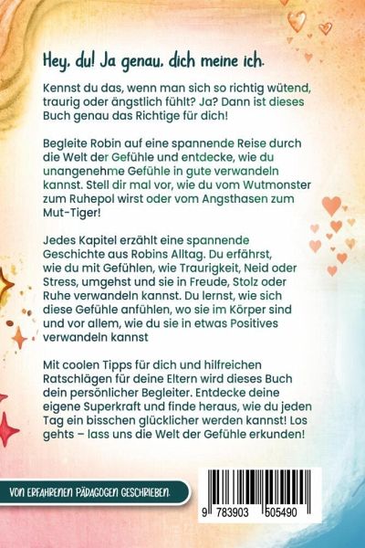 Ein Buch, das Kinder stark, glücklich und selbstbewusst machtHast du jemals das Gefühl gehabt, dass die Welt um dich herum ein einziges Durcheinander aus Emotionen ist? Besonders für Kinder kann das Leben oft wie eine Achterbahnfahrt der Gefühle erscheinen. Genau hier setzt "Die Superkraft der Gefühle" an!Dieses Buch richtet sich an Kinder im Alter von 6 bis 10 Jahren und begleitet sie auf einer aufregenden Reise durch die bunte Welt der Gefühle. Kinder erleben Emotionen viel intensiver und direkter als Erwachsene. Manchmal können diese starken Gefühle überwältigend sein - und genau deshalb ist dieses Buch so wertvoll.In "Die Superkraft der Gefühle" lernt dein Kind, wie es unangenehme Gefühle in etwas Gutes verwandeln kann. Begleitet Robin, ein fröhliches und neugieriges Kind, das euch zeigt, wie es emotionale Herausforderungen meistert und unangenehme Gefühle, wie Wut, Angst oder Neid, in positive Erfahrungen, wie Gelassenheit, Mut oder Stolz, verwandelt.Die Idee und die Inhaltedieses Buches basieren auf der therapeutischen und pädagogischen Arbeit mit Kindern. Im Austausch mit der Leiterin eines Mutter-Kind-Zentrums und Dipl. Sozialarbeiterin sowie Humanenergetikerin wurde dieses Buch von einer Lehrerin für Förderschulen und Inklusion geschrieben, die bereits viele Kinder mit emotionalen und sozialen Bedürfnissen begleitete und förderte.Jedes Kapitel erzählt eine kindgerechte Geschichte, die auf alltäglichen Erlebnissen basiert, die dein Kind gut nachvollziehen kann. Durch anschauliche Beschreibungen erfährt es, wie sich verschiedene Gefühle anfühlen und wo sie im Körper spürbar sind. Robin zeigt Schritt für Schritt, wie Emotionen transformiert werden können, und motiviert dein Kind, selbst aktiv zu werden.Warum ist dieses Buch so wertvoll für Kinder?Empathie und Verständnis: Kinder lernen, ihre eigenen Gefühle und die ihrer Mitmenschen besser zu verstehen.Emotionale Intelligenz: Durch praktische Tipps und Geschichten entwickeln Kinder Fähigkeiten zur Emotionsregulation.Selbstbewusstsein: Das Buch fördert das Selbstbewusstsein und hilft Kindern, sich selbst und ihre Gefühle zu akzeptieren und positiv zu gestalten.Unterstützung für Eltern: Neben hilfreichen Tipps für Kinder bietet dieses Buch auch wertvolle Ratschläge für Eltern, um ihre Kinder im Umgang mit Emotionen zu unterstützen.Zusätzlich enthält das Buch Checklisten für Kinder und Eltern, die helfen, das Gelernte im Alltag umzusetzen und zu festigen.Dieses Buch ist mehr als nur eine Sammlung von Geschichten - es ist ein Werkzeug, das Kindern hilft, ihre Superkraft zu entdecken: die Fähigkeit, ihre Gefühle zu verwandeln. Bereite dein Kind auf eine Reise vor, die es stärker, glücklicher und selbstbewusster macht. Taucht gemeinsam ein in die Welt der Gefühle und entdeckt, wie aus jeder Herausforderung eine neue Chance wird!Begleite dein Kind auf seinem Weg zu mehr emotionaler Stärke und Glück!