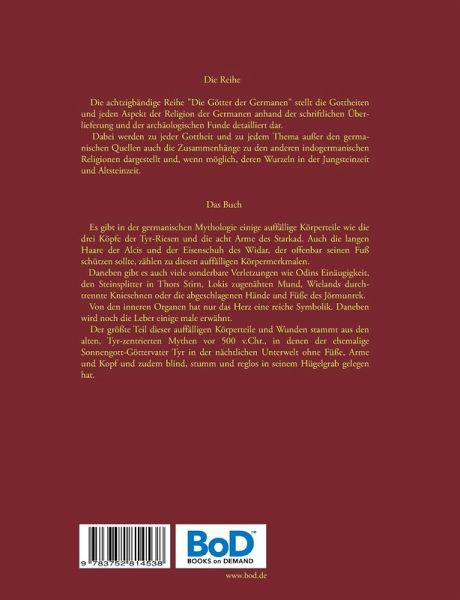 Die ReiheDie achtzigbändige Reihe "Die Götter der Germanen" stellt die Gottheiten und jeden Aspekt der Religion der Germanen anhand der schriftlichen Überlieferung und der archäologischen Funde detailliert dar.Dabei werden zu jeder Gottheit und zu jedem Thema außer den germanischen Quellen auch die Zusammenhänge zu den anderen indogermanischen Religionen dargestellt und, wenn möglich, deren Wurzeln in der Jungsteinzeit und Altsteinzeit.Das BuchEs gibt in der germanischen Mythologie einige auffällige Körperteile wie die drei Köpfe der Tyr-Riesen und die acht Arme des Starkad. Auch die langen Haare der Alcis und der Eisenschuh des Widar, der offenbar seinen Fuß schützen soll, zählen zu diesen auffälligen Körpermerkmalen.Daneben gibt es auch viele sonderbare Verletzungen wie Odins Einäugigkeit, den Steinsplitter in Thors Stirn, Lokis zugenähten Mund, Wielands durchtrennte Kniesehnen und die abgeschlagenen Hände und Füße des Jörmunrek.Von den inneren Organen hat nur das Herz eine reiche Symbolik. Daneben wird noch die Leber einige Male erwähnt.Der größte Teil dieser auffälligen Körperteile und Wunden stammt aus den alten, Tyr-zentrierten Mythen vor 500 v.Chr., in denen der ehemalige Sonnengott-Göttervater Tyr in der nächtlichen Unterwelt ohne Füße, Arme und Kopf und zudem blind, stumm und reglos in seinem Hügelgrab gelegen hat.