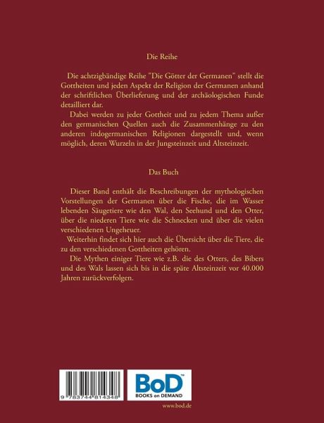 Die ReiheDie achtzigbändige Reihe "Die Götter der Germanen" stellt die Gottheiten und jeden Aspekt der Religion der Germanen anhand der schriftlichen Überlieferung und der archäologischen Funde detailliert dar.Dabei werden zu jeder Gottheit und zu jedem Thema außer den germanischen Quellen auch die Zusammenhänge zu den anderen indogermanischen Religionen dargestellt und, wenn möglich, deren Wurzeln in der Jungsteinzeit und Altsteinzeit.Das BuchDieser Band enthält die Beschreibungen der mythologischen Funktionen der Fische, der im Wasser lebenden Säugetiere wie dem Wal, dem Seehund und dem Otter, der niederen Tiere wie den Schnecken, sowie der vielen verschiedenen Ungeheuer.Weiterhin findet sich hier auch die Übersicht über die Tiere, die zu den verschiedenen Gottheiten gehören.Die Mythen einiger Tiere wie z.B. die des Otters, des Bibers und des Wals lassen sich bis in die späte Altsteinzeit vor 40.000 Jahren zurückverfolgen.