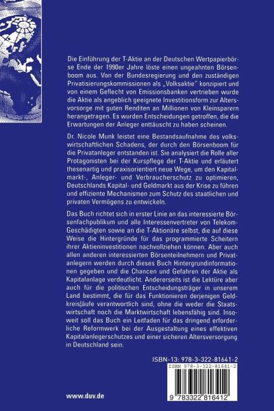 ermögens zu entwickeln. Das Buch richtet sich in erster Linie an das interessierte Börsenfachpublikum und alle Interessenvertreter von Telekom-Geschädigten sowie an die T-Aktionäre selbst, die auf diese Weise die Hintergründe für das Scheitern ihrer Aktieninvestitionen nachvollziehen können. Aber auch allen anderen interessierten Börsenteilnehmern und Privatanlegern werden durch dieses Buch Hintergrundinformationen gegeben und die Chancen und Gefahren der Aktie als Kapitalanlage verdeutlicht. Andererseits ist die Lektüre aber auch für die politischen Entscheidungsträger in unserem Land…mehr