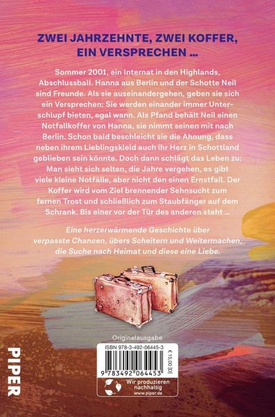 Schon bald beschleicht sie die Ahnung, dass neben Zahnbürste und Lieblingskleid auch ihr Herz in Schottland geblieben sein könnte. Doch dann schlägt das Leben zu: Man sieht sich zu selten und die Jahre vergehen, es gibt viele kleine Notfälle, aber nicht den einen Ernstfall, und der Koffer wird vom Ziel brennender Sehnsucht zum fernen Trost und schließlich zum Staubfänger auf dem Schrank. Bis einer vor der Tür des anderen steht ...