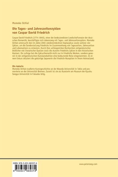 Caspar David Friedrich (1774-1840), einer der bedeutendsten Landschaftsmaler der deutschen Romantik, beschäftigte sich lebenslang mit Tages- und Jahreszeitenzyklen. Momoko Ochiai untersucht den im Jahre 2004 wiederentdeckten Sepiazyklus sowie weitere vier Zyklen, um die Sonderstellung Friedrichs im Zusammenhang von Tageszeiten, Jahreszeiten und Lebensaltern zu erläutern. Durch ihre umfangreichen Recherchen zeitgenössischer bildlicher wie literarischer Quellen stellt die Autorin Friedrichs Zyklen in den historischen Kontext. Ihr zufolge hat die Zyklusthematik nicht nur in Friedrichs Werken, sondern generell in der zeitgenössischen Kunstproduktion eine bedeutende Rolle eingenommen. In einem Exkurs skizziert die gebürtige Japanerin die Friedrich-Rezeption in ihrem Heimatland.
