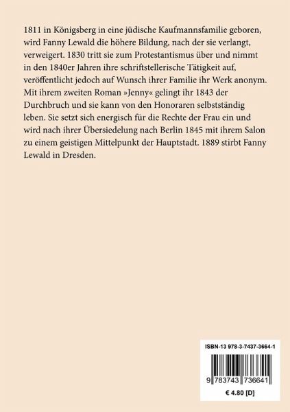 1811 in Königsberg in eine jüdische Kaufmannsfamilie geboren, wird Fanny Lewald die höhere Bildung, nach der sie verlangt, verweigert. 1830 tritt sie zum Protestantismus über und nimmt in den 1840er Jahren ihre schriftstellerische Tätigkeit auf, veröffentlicht jedoch auf Wunsch ihrer Familie ihr Werk anonym. Mit ihrem zweiten Roman "Jenny" gelingt ihr 1843 der Durchbruch und sie kann von den Honoraren selbstständig leben. Siesetzt sich energisch für die Rechte der Frau ein und wird nach ihrer Übersiedelung nach Berlin 1845 mit ihrem Salon zu einem geistigen Mittelpunkt der Hauptstadt. 1889 stirbt Fanny Lewald in Dresden.
