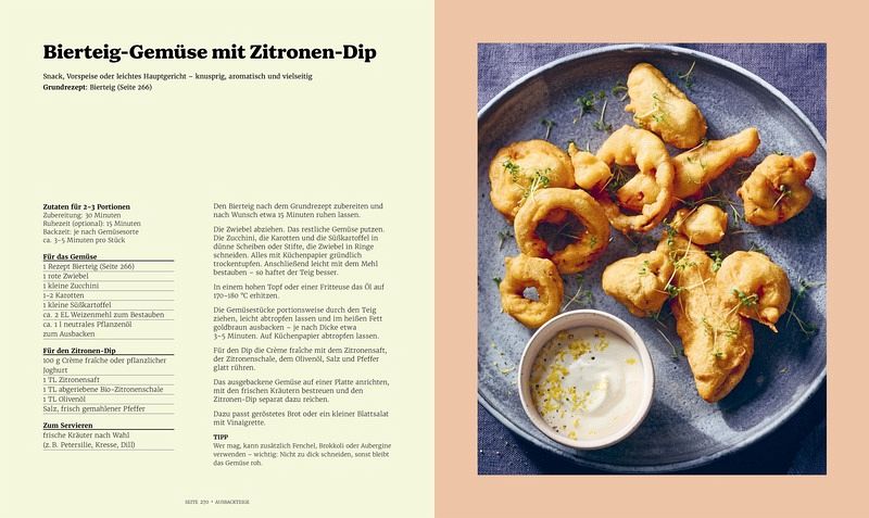 Insgesamt vereint das Buch 75 bewährte Grundrezepte und 70 zusätzliche Rezeptideen von Biskuit bis Tempura, von Pancakes bis Pinsa. So entsteht eine umfassende Rezeptsammlung mit über 140 Rezepten, die sowohl Anfängern als auch ambitionierten Hobbybäckern und -köchen ein verlässlicher Begleiter ist.