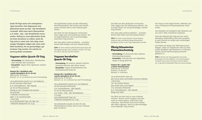 Besonders gelungen ist der praxisnahe Aufbau: Zu jedem Teig werden nicht nur Zubereitung und Varianten erklärt, sondern auch hilfreiche Tipps und Hintergrundwissen vermittelt. Etwa zu Mehlsorten aus Deutschland, Österreich, der Schweiz und Italien. Ein alphabetisches Rezeptregister sowie ein Glossar mit Begriffserklärungen runden das Werk ab.