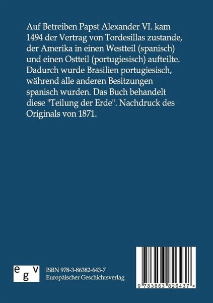 Auf Betreiben Papst Alexander VI. kam 1494 der Vertrag von Tordesillas zustande, der Amerika in einen Westteil (spanisch) und einen Ostteil (portugiesisch) aufteilte. Dadurch wurde Brasilien portugiesisch, während alle anderen Besitzungen spanisch wurden. Das Buch behandelt diese "Teilung der Erde". Nachdruck des Originals von 1871.