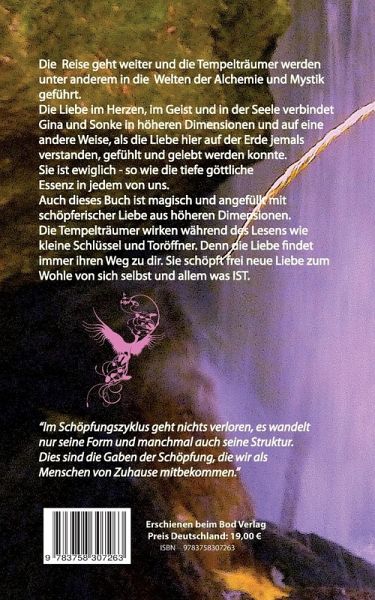 Die Reise geht weiter und die Tagebücher bleiben äußerst spannend, denn Gina und Sonke werden unter anderem in die Welten der Alchemie und Mystik geführt.Die Liebe im Herzen, im Geist und in der Seele verbindet sie beide in höhere Dimensionen und auf eine andere Weise, als die Liebe hier auf der Erde bisher jemals verstanden und gelebt werden konnte. Sie ist ewiglich - so wie die tiefe göttliche Essenz in jedem von uns. Die Tempelträumer Trilogie hat nun schon ein viertes Buch. Dieses Buch ist wie die anderen magisch und angefüllt mit schöpferischer Liebe aus neuen Dimensionen.
