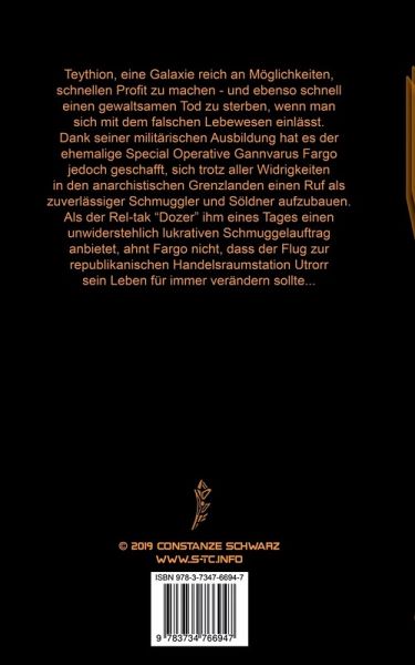 Teythion, eine Galaxie reich an Möglichkeiten, schnellen Profit zu machen - und ebenso schnell einen gewaltsamen Tod zu sterben, wenn man sich mit dem falschen Lebewesen einlässt.Dank seiner militärischen Ausbildung hat es der ehemalige Special Operative Gannvarus Fargo jedoch geschafft, sich trotz aller Widrigkeiten in den anarchistischen Grenzlanden einen Ruf als zuverlässiger Schmuggler und Söldner aufzubauen.Als der Rel-tak "Dozer" ihm eines Tages einen unwiderstehlich lukrativen Schmuggelauftrag anbietet, ahnt Fargo nicht, dass der Flug zur republikanischen Handelsraumstation Utrorr sein Leben für immer verändern sollte.