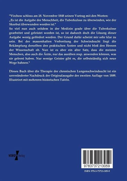 Dieses Buch über die Therapie der chronischen Lungenschwindsucht ist ein unveränderter Nachdruck der Originalausgabe der zweiten Auflage von 1889. Illustriert mit mehreren historischen Tafeln.