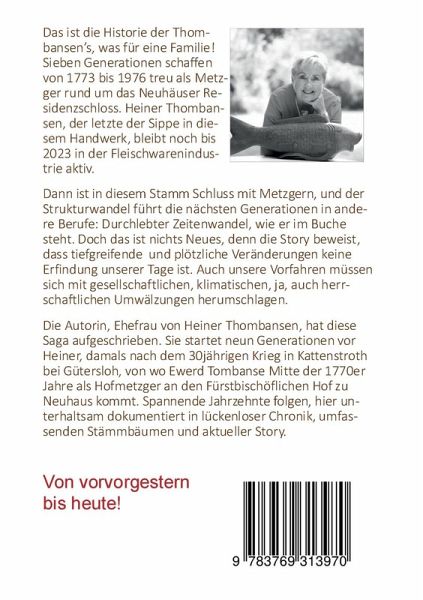 Das ist die Geschichte der Thombansen`s, was für eine Familie! Sieben Generationen schaffen von 1773 bis 1976 treu als Metzger rund um das Residenzschloss in Neuhaus. Der letzte Metzger der Sippe, Heiner Thombansen, bleibt bis 2023 in der Fleischwarenindustrie. Dann ist in dem Stamm Schluss mit Metzgern, und der Strukturwandel führt die nächsten Generationen in andere Berufe: Erlebter Zeitenwandel, wie er im Buche steht - aber nichts Neues, denn die Story beweist, dass tiefe und plötzliche Veränderungen keine Erfindung unserer Tage sind. Auch unsere Vorfahren müssen sich mit klimatischen, gesellschaftlichen, gesundheitlichen, ja, auch Herrschafts-Veränderungen herumschlagen. Die Thombansen-Saga startet neun Generationen vor Heiner, damals nach dem 30jährigen Krieg in Kattenstroth bei Gütersloh, von wo Ewerd Tombanse Mitte der 1770er Jahre als Hofmetzger an den Fürstbischöflichen Hof in Neuhaus kommt. Spannende Jahrzehnte folgen, hier dokumentiert in lückenloser Chronik und vielen Stämmbäumen bis in die aktuelle Gegenwart.