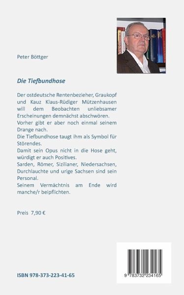 Der ostdeutsche Rentenbezieher, Graukopf und Kauz Klaus-Rüdiger Mützenhausen will dem Beobachten unliebsamer Erscheinungen abschwören. Aber vorher gibt er noch einmal seinem Drange nach.Die Tiefbundhose taugt ihm als Symbol für Störendes. Damit sein Opus nicht in die Hose geht, würdigt er auch Positives.Sarden, Römer, Sizilianer, Niedersachsen, Durchlauchte und urige Sachsen sind sein Personal. Seinem Vermächtnis am Schluss wird manche/r beipflichten.