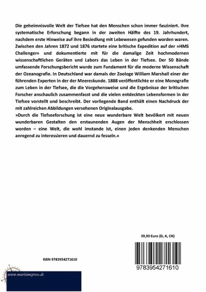 Die geheimnisvolle Welt der Tiefsee hat den Menschen schon immer fasziniert. Ihre systematische Erforschung begann in der zweiten Hälfte des 19. Jahrhundert, nachdem erste Hinweise auf ihre Besiedlung mit Lebewesen gefunden worden waren. Zwischen den Jahren 1872 und 1876 startete eine britische Expedition auf der "HMS Challenger" und dokumentierte mit für die damalige Zeit hochmodernen wissenschaftlichen Geräten und Labors das Leben in der Tiefsee. Der 50 Bände umfassende Forschungsbericht wurde zum Fundament für die moderne Wissenschaft der Ozeanografie. In Deutschland war damals der Zoologe William Marshall einer der führenden Experten in der der Meereskunde. 1888 veröffentlichte er eine Monografie zum Leben in der Tiefsee, die die Vorgehensweise und die Ergebnisse der britischen Forscher anschaulich zusammenfasst und die vielen entdeckten Lebensformen in der Tiefsee vorstellt und beschreibt. Der vorliegende Band enthält einen Nachdruck der mit zahlreichen Abbildungen versehenen Originalausgabe.