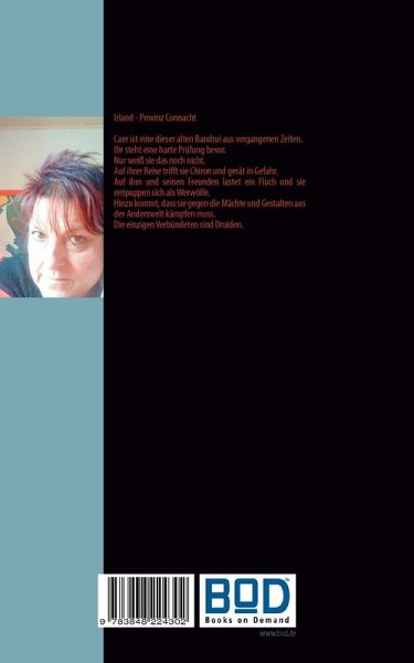 Irland - Provinz ConnachtCaer ist eine dieser alten Bandrui aus vergangenen Zeiten.Ihr steht eine harte Prüfung bevor.Nur weiß sie das noch nicht.Auf ihrer Reise trifft sie Chiron und gerät in Gefahr.Auf ihm und seinen Freunden lastet ein Fluch und sie entpuppen sich als Werwölfe.Hinzu kommt, dass sie gegen die Mächte und Gestalten aus der Anderswelt kämpfen muss.Die einzigen Verbündeten sind Druiden.
