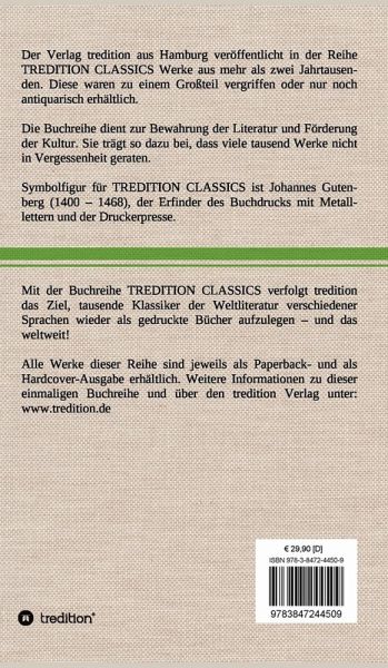 Diese Hardcover-Ausgabe ist Teil der TREDITION CLASSICS. Der Verlag tredition aus Hamburg veröffentlicht in der Buchreihe TREDITION CLASSICS Werke aus mehr als zwei Jahrtausenden. Diese waren zu einem Großteil vergriffen oder nur noch antiquarisch erhältlich. Mit TREDITION CLASSICS verfolgt tredition das Ziel, tausende Klassiker der Weltliteratur verschiedener Sprachen wieder als gedruckte Bücher zu verlegen und das weltweit! Die Buchreihe dient zur Bewahrung der Literatur und Förderung der Kultur. Sie trägt so dazu bei, dass viele tausend Werke nicht in Vergessenheit geraten.