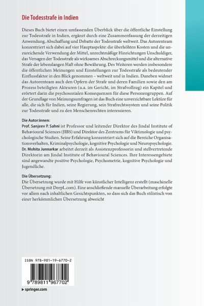 Dieses Buch bietet einen umfassenden Überblick über die öffentliche Einstellung zur Todesstrafe in Indien, ergänzt durch eine Zusammenfassung der derzeitigen Anwendung, Abschaffung und Debatte der Todesstrafe weltweit. Das Autorenteam konzentriert sich dabei auf vier Hauptaspekte: die überhöhten Kosten und die unzureichende Verwendung der Mittel, unrechtmäßige Hinrichtungen Unschuldiger, das Versagen der Todesstrafe als wirksames Abschreckungsmittel und die alternative Strafe der lebenslangen Haft ohne Bewährung. Des Weiteren werden insbesondere die öffentlichen Meinungen und Einstellungen zur Todesstrafe als bedeutender Einflussfaktor in den Blick genommen - weltweit und in Indien. Daneben widmet das Autorenteam auch den Opfern der Strafe und deren Familien sowie den am Prozess beteiligten Akteuren (u.a. im Gericht, im Strafvollzug) ein Kapitel und erörtert darin die psychosozialen Konsequenzen für diese Personengruppen. Auf der Grundlage von Meinungsumfragen ist das Buch eine unverzichtbare Lektüre für alle, die sich für Indien, seine Regierung, sein Strafrechtssystem und seine Politik zur Todesstrafe und zu den Menschenrechten interessieren.