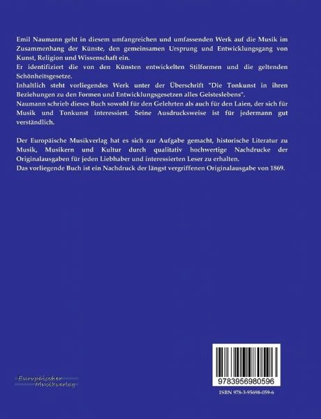 Emil Naumann geht in diesem umfangreichen und umfassenden Werk auf die Musik im Zusammenhang der Künste, den gemeinsamen Ursprung und Entwicklungsgang von Kunst, Religion und Wissenschaft ein.