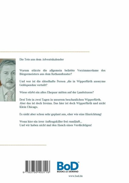 Die Tote aus dem AdventskalenderWarum stürzte die allgemein beliebte Vorzimmerdame des Bürgermeisters aus dem Rathausfenster?Und wer ist die rätselhafte Person, die in Wipperfürth anonyme Geldspenden verteilt?Wieso stirbt ein altes Ehepaar mitten auf der Landstrasse?Drei Tote in zwei Tagen in unserem beschaulichen Wipperfürth.Aber das ist doch Irrsinn. Das hier ist doch Wipperfürth und nicht Klein Chicago.Es sieht aber schon sehr geplant aus, eher wie eine Hinrichtung!Wenn hier ein irrer Auftragskiller frei rumläuft...Und wir haben nicht mal den Hauch eines Verdächtigen!