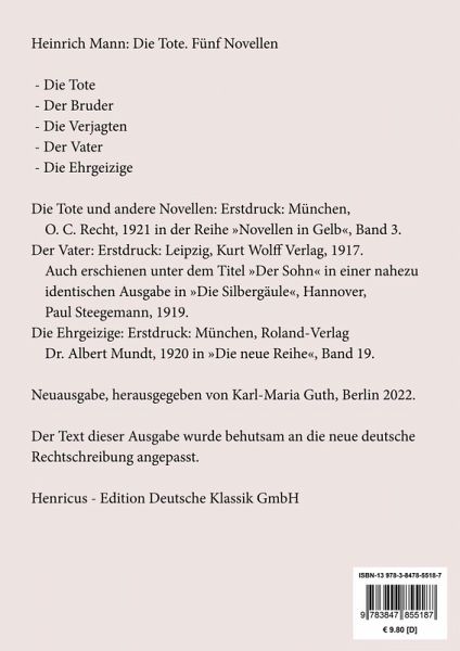 Heinrich Mann: Die Tote. Fünf NovellenLesefreundlicher Großdruck in 16-pt-SchriftGroßformat, 210 x 297 mmBerliner Ausgabe, 2023Durchgesehener Neusatz bearbeitet und eingerichtet von Theodor BorkenDie Tote - Der Bruder - Die Verjagten: Erstdruck: München, O. C. Recht, 1921 in der Reihe »Novellen in Gelb«, Band 3.Der Vater: Erstdruck: Leipzig, Kurt Wolff Verlag, 1917. Auch erschienen unter dem Titel »Der Sohn« in einer nahezu identischen Ausgabe in »Die Silbergäule«, Hannover, Paul Steegemann, 1919.Die Ehrgeizige: Erstdruck: München, Roland-Verlag Dr. Albert Mundt, 1920 in »Die neue Reihe«, Band 19.Inhaltsverzeichnis:Der Text dieser Ausgabe wurde behutsam an die neue deutsche Rechtschreibung angepasst.Umschlagabbildung: Sophie Koner, Bildnis der Frau K., 1900Gesetzt aus der Minion Pro, 16 pt.Henricus - Edition Deutsche Klassik GmbHÜber den Autor:1871 als erstes Kind des Lübecker Kaufmanns und späteren Senators Thomas Johann Heinrich Mann und dessen brasilianisch-deutscher Ehefrau Julia da Silva-Bruhns in den hanseatischen Wohlstand der Gründerjahre hineingeboren, verlässt Luiz Heinrich Mann das Gymnasium bereits in der Unterprima und absolviert nach einer rasch wieder abgebrochenen Buchhändlerlehre in Dresden ein Volontariat bei S. Fischer in Berlin. Bis zum Kriegsausbruch unternimmt er - in München lebend - ausgedehnte Reisen nach Italien, oft in Begleitung seines jüngeren Bruders Thomas, mit dem er sich 1914 über dessen deutschnationale Anschauung überwirft. Er emigriert mit seiner zweiten Ehefrau Nelly Kröger 1933 nach Frankreich, nachdem die Nazis ihn zunächst aus der Akademie der Künste ausschließen und ihm schließlich die deutsche Staatsbürgerschaft aberkennen. In Paris wird er Vorsitzender des Vorbereitenden Ausschusses der deutschen Volksfront (Lutetia Kreis) und die SPD wählt ihn zu ihrem Ehrenpräsidenten. 1940 fliehen Nelly und er in die USA. Land und Leute seines Zufluchtslandes bleiben ihm fremd, noch vor Kriegsende begeht die schwer alkoholkranke Nelly Selbstmord - wie zuvor beide Schwestern Heinrich Manns (Clara 1910 und Julia 1927). 1949 wird er zum Präsidenten der Deutschen Akademie der Künste in Ostberlin gewählt. Am 11. März 1950 stirbt Heinrich Mann in Santa Monica, Kalifornien, unweit des Wohnsitzes seines Bruders Thomas in Pacific Palisades, bevor er die geplante Rückkehr nach Deutschland antreten kann. Seine Urne wird 1961 in die DDR überführt und auf dem Dorotheenstädtischen Friedhof beigesetzt.