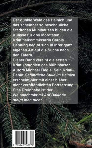 Der dunkle Wald des Hainich und das scheinbar so beschauliche Städtchen Mühlhausen bilden die Kulisse für drei Mordtaten. Kriminalkommissarin Carola Henning begibt sich in ihrer ganz eigenen Art auf die Suche nach den Tätern. Dieser Band vereint die ersten Krimikomödien des Mühlhäuser Autors Michael Fiegle. Sein Krimi-Debüt Gefährliche Stille im Hainich erscheint hier mit einer bisher nicht veröffentlichten Fortsetzung. Eine Dreingabe ist der Weihnachtskrimi Auf Balkone steigt man nicht.