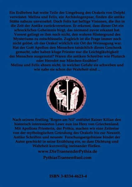 Ein Erdbeben führt Melina und Felix, ein Archäologenpaar, nach Delphi. Es hat weite Teile der Umgebung verwüstet. Das antike Orakel und seine Ruinen sind äußerlich unversehrt, doch Felix hat plötzlich heftige Visionen, die ihn in die Zeit der Antike sehen lassen. Er erkennt, dass dieser Ort ein schreckliches Geheimnis verbirgt, das niemand vor ihm erkannt hat. Unter Lebensgefahr versuchen Melina und Felix das blutige Mysterium zu entschlüsseln. War das Orakel tatsächlich ein Ort der Weissagung? Hat der Gott Apollon wirklich den Menschen dieses Geschenk gemacht, oder waren es doch nur kluge Priester, die die Leichtgläubigkeit der Menschen ausgenutzt haben? Waren die antiken Schreiber wie Plutarch, Herodot oder Pausanias nur Märchenerzähler? Melina und Felix ahnen nicht, wie nahe sie schon der Wahrheit sind ... "Die Tränen der Pythia" entführt den Leser an einen mystischen Ort der Antike Griechenlands, der als Nabel der Welt galt. Vom einfachen Bauer bis zum lydischen König Krösus haben sich die Menschen der Antike ihr Schicksal dort weissagen lassen. Der Roman schlägt einen Bogen von der Antike bis in die Neuzeit. Wie bereits in "Regen am Nil" verbindet der Autor antike Schriften und neueste Forschung geschickt miteinander, so dass Dichtung und Wahrheit kurzweilig ineinander fließen.