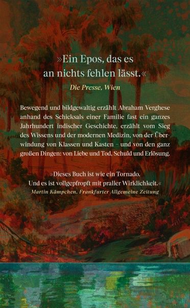 Abraham Verghese schlägt in seinem lang erwarteten, bewegenden und bildgewaltigen neuen Roman einen epischen Bogen durch fast ein ganzes Jahrhundert indischer Geschichte. Er erzählt anhand des Schicksals einer Familie vom Sieg des Wissens und der modernen Medizin, von der Überwindung von Klassen und Kasten - und von den ganz großen Dingen: von Liebe und Tod, Schuld und Erlösung.