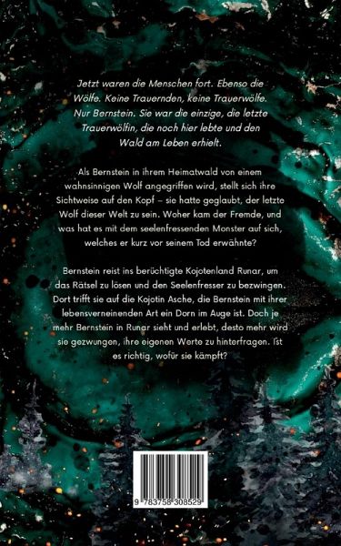 Jetzt waren die Menschen fort. Ebenso die Wölfe. Keine Trauernden, keine Trauerwölfe. Nur Bernstein. Sie war die einzige, die letzte Trauerwölfin, die noch hier lebte und den Wald am Leben erhielt.Als Bernstein in ihrem Heimatwald von einem wahnsinnigen Wolf angegriffen wird, stellt sich ihre Sichtweise auf den Kopf - sie hatte geglaubt, der letzte Wolf dieser Welt zu sein. Woher kam der Fremde, und was hat es mit dem seelenfressenden Monster auf sich, welches er kurz vor seinem Tod erwähnte?Bernstein reist ins berüchtigte Kojotenland Runar, um das Rätsel zu lösen und den Seelenfresser zu bezwingen. Dort trifft sie auf die Kojotin Asche, die Bernstein mit ihrer lebensverneinenden Art ein Dorn im Auge ist. Doch je mehr Bernstein in Runar sieht und erlebt, desto mehr wird sie gezwungen, ihre eigenen Werte zu hinterfragen. Ist es richtig, wofür sie kämpft?Für jugendliche und erwachsene Wolfliebhaber und Tierfantasy-Fans - ein mythisches Abenteuer übers Festhalten und Loslassen, überWiedergeburt und Unsterblichkeit, Freundschaft und Verlust.