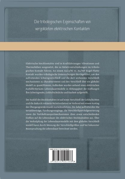 Elektrische Steckkontakte sind in Kraftfahrzeugen Vibrationen und Thermohüben ausgesetzt, die zu Relativverschiebungen im tribologischen Kontakt führen. An einem AuCo/Ni vs. Au/NiP Kugel-Platte-Kontakt wurden tribologische Untersuchungen durchgeführt, um den auftretenden Schwingverschleiß und die dort wirkenden Verschleißmechanismen zu charakterisieren und den Verschleiß über ein globales Modell zu quantifizieren. Außerdem wurden anhand eines elektrischen Ausfallkriteriums Lebensdauermodelle in Abhängigkeit der Einflussgrößen Schwingweite, Goldschichtdicke und Rauheit aufgestellt. Der Ausfall des Steckkontaktes ist auf einen Verschleiß der Goldschichten und die dadurch initiierte Nickeloxidation im Verbund mit einem Anstieg des Übergangswiderstands zurückzuführen. Die dabei auftretenden Materialüberträge, Furchungsvorgänge, die Verschleißpartikelgenerierung sowie die Partikeltransportmechanismen üben einen entscheidenden Einfluss auf die Lebensdauer des elektrischen Steckkontaktes aus. Über die Verknüpfung der Lebensdauermodelle mit dem globalen Verschleißmodell kann durch Messung der Verschleißgrößen und bei bekannter Beanspruchung die Lebensdauer berechnet werden.