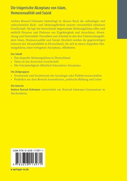 Andrea Brassel-Ochmann hinterfragt in diesem Buch die unbedingte und unbeschränkte Rede- und Meinungsfreiheit unserer vermeintlich tabulosen Gesellschaft. Sie legt das herrschende hegemoniale Meinungsklima offen und enthüllt Prozesse und Diskurse um Zugehörigkeit und Ausschluss, Abweichung und Normalität, Fremdheit und Alterität in den drei Untersuchungsfeldern Islam, Homosexualität und Suizid. Deutlich werden die gegenwärtigen Grenzen der Akzeptabilität in Deutschland, die sich in einem doppelten Meinungsklima, einer verlogenen Akzeptanz, offenbaren.