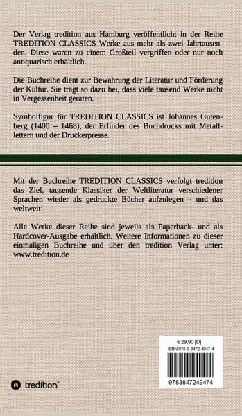 Diese Hardcover-Ausgabe ist Teil der TREDITION CLASSICS. Der Verlag tredition aus Hamburg veröffentlicht in der Buchreihe TREDITION CLASSICS Werke aus mehr als zwei Jahrtausenden. Diese waren zu einem Großteil vergriffen oder nur noch antiquarisch erhältlich. Mit TREDITION CLASSICS verfolgt tredition das Ziel, tausende Klassiker der Weltliteratur verschiedener Sprachen wieder als gedruckte Bücher zu verlegen und das weltweit! Die Buchreihe dient zur Bewahrung der Literatur und Förderung der Kultur. Sie trägt so dazu bei, dass viele tausend Werke nicht in Vergessenheit geraten.