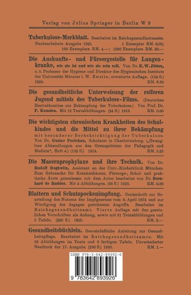 Erster Teil. Die Tuberkulose und ihre Bekämpfung.- I. Die Geschichte der Lehre von der Tuberkulose.- II. Der Tuberkelbazillus.- III. Die Ansteckungswege der Tuberkulose.- IV. Die Widerstandsfähigkeit gegen die Tuberkulose.- V. Der Verlauf der Tuberkulose.- VI. Die Behandlung der Lungentuberkulose.- VII. Die Bekämpfung der Tuberkulose als Volkskrankheit.- VIII. Was jedermann von der Tuberkulose wissen muß.- Zweiter Teil. Der Kampf gegen die Tuberkulose durch die Schule.- I. Anteilnahme der Schule an der Tuberkulosebekämpfung.- II Direkte Maßnahmen der Schule zur Tuberkulosebekämpfung.- III. Die indirekte Bekämpfung der Tuberkulose.- IV. Der Tuberkulose-Unterricht in der Schule.- V. Die Belehrung über die Tuberkulose.