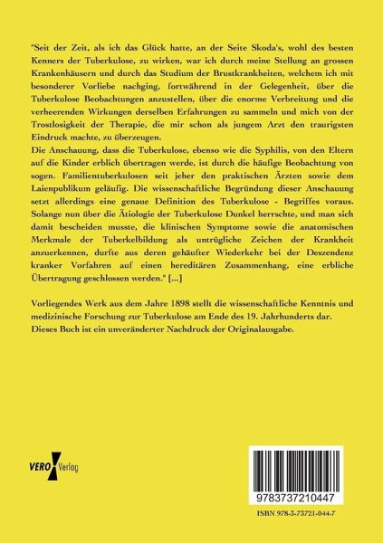 Die Anschauung, dass die Tuberkulose, ebenso wie die Syphilis, von den Eltern auf die Kinder erblich übertragen werde, ist durch die häufige Beobachtung von sogen. Familientuberkulosen seit jeher den praktischen Ärzten sowie dem Laienpublikum geläufig. Die wissenschaftliche Begründung dieser Anschauung setzt allerdings eine genaue Definition des Tuberkulose - Begriffes voraus. Solange nun über die Ätiologie der Tuberkulose Dunkel herrschte, und man sich damit bescheiden musste, die klinischen Symptome sowie die anatomischen Merkmale der Tuberkelbildung als untrügliche Zeichen der Krankheit anzuerkennen, durfte aus deren gehäufter Wiederkehr bei der Deszendenz kranker Vorfahren auf einen hereditären Zusammenhang, eine erbliche Übertragung geschlossen werden." [...]