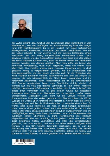 Der Autor erzählt den Aufstieg der Tuchmacher-Stadt Spremberg in der Niederlausitz, von den Anfängen der Industrialisierung über die Kriegs- und DDR-Nachkriegsjahre, bis in die Neuzeit, mit vielen historischen Hintergründen, Anekdoten, schmunzel und liebes Geschichten, wie sie das Leben schreibt. Es war wichtig, weil die meisten Zeitzeugen schon verstorben sind und wenig Informationen hinterlassen haben. Doch genauso wichtig, wie die Gedenkfeiern gegen den Krieg und das Leiden der sechs Millionen KZ-Toten sind, muss uns immer wieder ins Gedächtnis gerufen werden, was damals geschah. Aber man sollte die Leiden der deutschen Bevölkerung, auch nicht vergessen, denn das waren nicht alles Nazis. Die meisten waren ganz normale Menschen und es darf genauso wenig in Vergessenheit geraten, wie die Schandtaten der Besatzungsmächte, die das ganze deutsche Volk für die Ereignisse der Hitler Diktatur bestrafen wollten. Insbesondere sind hier die Sowjets zu nennen, die sich widerrechtlich ein Stück Polen aneigneten und im Potsdamer Abkommen, ihren Machtbereich bis an die innerdeutsche DDR-Grenze ausdehnten. Wenn man Geschichte richtig deutet, ist niemals nur ein Volk das alleinig Schuldige. Es sind immer mehrere beteiligt, Ursachen und Wirkungen zu verstehen, das ist die Botschaft, die dieses Buch vermitteln will. Es gab keinen Grund für Napoleon Bonaparte ganz Europa zu überfallen und zu zerstören, außer seiner unbegrenzten Machtgier. Auch nicht für die Gräuel, welche der Kommunismus über die Völker gebracht hat. Ebenso haben die Völker Europas die Juden über Jahrhunderte verfolgt. Es waren nicht die ersten Juden-Pogrome, welche die Nazi-Verbrecher zu verantworten haben. Es waren viele kleine Bausteine, die man in ganz Europa aufsammeln kann, welche dazu geführt haben. Auch die Katholische Kirche hat der halben Welt ihren alleinseligmachenden Glauben aufgezwungen und im Dreißigjährigen Krieg, halb Europa entvölkert. Man hat bedenkenlos die indigenen Völker überfallen,in ganz Nordamerika die Indianer abgeschlachtet. Alle sind schuldig, in fast jedem Staate der Erde. Alle diese Ereignisse haben unendliches Leid über die Bevölkerungen gebracht, das muss endlich, und zwar von allen Völkern aufgearbeitet werden. In den USA werden Schwarze erschossen, das ist nur die Fortsetzung des Leides der schwarzen Sklaven. Und auch die Israelis scheinen nicht viel aus ihrer eigenen Geschichte gelernt zu haben und können mit den Völkern, in ihrem gelobten Land keinen Frieden machen.