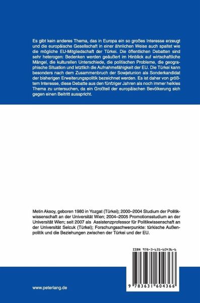 Aus dem Inhalt: Metin Aksoy: Einleitung - Metin Aksoy: Historischer Überblick über die Beziehungen zwischen der EU und der Türkei - Metin Aksoy: Die Türkei und Entwicklungen hinsichtlich der Beitrittskriterien - Ali Ayata: Demokratie und Menschenrechte in der Türkei - Ludwig Schmahl: Kulturelle Überdehnung? Historisch kulturelle Debatte - Ludwig Schmahl: Die Türkei und die europäische Identität - Metin Aksoy: Der Zypernkonflikt und die Türkei - Ali Ayata: Der EU-Beitritt der Türkei im Kontext der GASP - Pawel Kobes: Mitgliedsaspirationen der Türkei zur Aufnahme in die EU im Kontext zu europäischer Sicherheit - Riza Arslan: Einstellung Deutschlands zum türkischen Beitritt in die EU - Hans Walter Schmuhl: Köprü heißt Brücke. Warum die Türkei Europa braucht und Europa die Türkei.