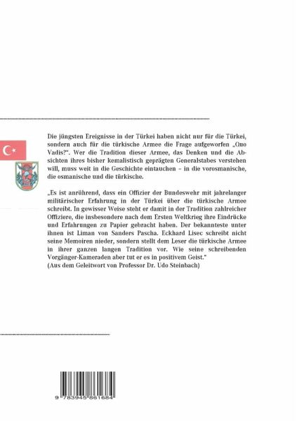 Dieses Buch stellt die Geschichte der türkischen Armee dar und behandelt im letzten Kapitel die Ereignisse des Putsches 2016. "Es ist anrührend, dass ein Offizier der Bundeswehr mit jahrelanger militärischer Erfahrung in der Türkei über die türkische Armee schreibt. In gewisser Weise steht er damit in der Tradition zahlreicher Offiziere, die insbesondere nach dem Ersten Weltkrieg ihre Eindrücke und Erfahrungen zu Papier gebracht haben. Der bekannteste unter ihnen ist Liman von Sanders Pascha. Eckhard Lisec schreibt nicht seine Memoiren nieder, sondern stellt dem Leser die türkische Armee in ihrer ganzen langen Tradition vor. Wie seine schreibenden Vorgänger-Kameraden aber tut er es in positivem Geist." (Aus dem Geleitwort von Prof. Dr. Udo Steinbach)