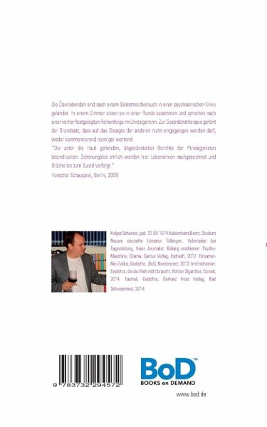Die Überlebenden sind nach einem Selbstmordversuch in einer psychiatrischen Klinik gelandet. In einem Zimmer sitzen sie in einer Runde zusammen und sprechen nach einer vorher festgelegten Reihenfolge im Uhrzeigersinn. Zur Gesprächstherapie gehört der Grundsatz, dass auf das Gesagte der anderen nicht eingegangen werden darf, weder kommentierend noch gar wertend.