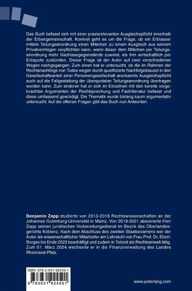 Das Buch befasst sich mit einer praxisrelevanten Ausgleichspflicht innerhalb der Erbengemeinschaft. Konkret geht es um die Frage, ob ein Erblasser mittels Teilungsanordnung einen Miterben zu einem Ausgleich aus seinem Privatvermögen verpflichten kann, wenn dieser dem Miterben per Teilungsanordnung mehr Nachlassgegenstände zuweist, als ihm wirtschaftlich per Erbquote zustünden. Dieser Frage ist der Autor auf zwei verschiedenen Wegen nachgegangen: Zum einen hat er untersucht, ob die im Rahmen der Rechtsnachfolge von Todes wegen durch qualifizierte Nachfolgeklausel in den Gesellschaftsanteil einer Personengesellschaft anerkannte Ausgleichspflicht auch auf die Fallgestaltung der überquotalen Teilungsanordnung übertragen werden kann. Zum anderen hat er sich im Einzelnen mit den bereits vorgebrachten Argumenten der Rechtsprechung und Fachliteratur befasst und diese umfassend gewürdigt. Die Thematik wurde bislang kaum argumentativ untersucht. Auf die offenen Fragen gibt das Buch nunAntworten.