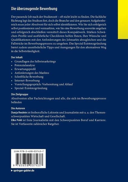 Der passende Job nach der Studienzeit - oft nicht leicht zu finden. Die fachliche Richtung legt das Studium fest, doch die Branche und den genauen Aufgabenbereich muss jeder Absolvent für sich selbst identifizieren. Wie Sie sich erfolgreich selbst positionieren und vermarkten, wie Sie eine Bewerbung souverän angehen und erfolgreich abschließen vermittelt dieses Kompaktwerk. Stärken-Schwächen-Profile und ausführliche Checklisten helfen Ihnen, Ihre Wünsche und Qualifikationen mit den Anforderungen des Jobmarkts abzugleichen und die Fallstricke im Bewerbungsprozess zu umgehen. Das Special Existenzgründung bietet zudem unentbehrliche Tipps und Anregungen für den alternativen Weg in die Selbstständigkeit.