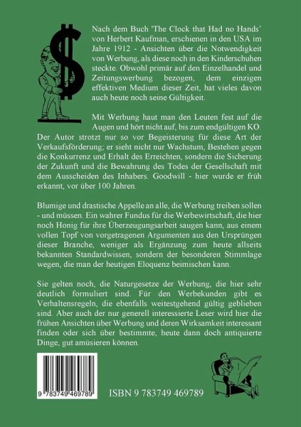 Die Uhr die keine Zeiger hatte - oder Werbung muss seinNach dem Buch 'The Clock that Had no Hands' von Herbert Kaufmann, erschienen in den USA im Jahre 1912 - Ansichten ueber die Notwendigkeit von Werbung, als diese noch in den Kinderschuhen steckte.Obwohl hauptsaechlich auf den Einzelhandel und Zeitungswerbung bezogen, dem einzigen effektiven Medium dieser Zeit, hat vieles am Inhalt auch heute noch seine Gueltigkeit.Werbung heißt zuschlagen, den Leuten auf die Augen hauen und nicht innehalten, bis zum finalen Niederschlag. Der Autor strotzt nur so vor Begeisterung fuer diese Art der Verkaufsfoerderung; er sieht nicht nur Wachstum, Bestehen gegen die Konkurrenz und Erhalt des Erreichten, sondern die Sicherung der Zukunft und die Bewahrung des Todes der Gesellschaft mit dem Ausscheiden des Inhabers. Goodwill - hier wurde er frueh erkannt, vor ueber 100 Jahren.Blumige und drastische Appelle an alle, die Werbung treiben sollen - und muessen. Ein wahrer Fundus fuer die Werbewirtschaft, die hier noch Honig fuer ihre Ueberzeugungsarbeit saugen kann, aus einem vollen Topf von vorgetragenen Argumenten aus den Urspruengen dieser Branche, weniger als Ergaenzung zum heute allseits bekannten Standardwissen, es geht insbesondere um die kraeftige und eindrucksvolle Stimmlage und Ueberzeugungskraft, die man der heutigen Eloquenz beimischen kann.Sie gelten noch, die Naturgesetze der Werbung, die hier sehr deutlich formuliert sind. Für den Werbekunden gibt es Verhaltensregeln, die ebenfalls weitestgehend noch Gültigkeit haben. Aber auch der nur generell interessierte Leser wird hier die fruehen Ansichten ueber Werbung und deren Wirksamkeit lesenswert finden und teileweise auch schmunzeln können.Alles ist auch ein Spiegelbild der Gesellschaft und macht es auch unter diesem Aspekt interessant. Erste und zweite Klasse sind nicht nur eine Einteilung im Zug, sondern auch eine Vorselektion des Umfeldes, das vielleicht ueberzeugt werden kann, aber dann das Geld nicht hat. Wer in Gegenden mit Mietshaeusern seine Werbung verbreiten laesst, kann seine Angel gleich in der Wueste auswerfen - Masse ohne Muskeln, der Versuch Austern in Rosenbueschen zu ernten. Geeignete Zeitungen werden gnadenlos selktiert, von serioes, bis zu Herausgebern, die ein 'journalistisches Abwasserloch' leiten. Wie wuerde sich Herbert Kaufmann, Autor des Buches und Zeitungsmann, doch wundern, wie sich das alles veraendert hat - und manche Passage entbehrt deshalb nicht einer gewissen Komik.
