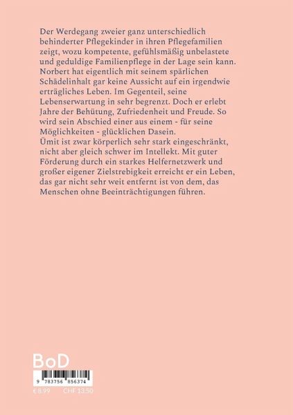 Der Werdegang zweier ganz unterschiedlich behinderter Pflegekinder in ihren Pflegefamilien zeigt, wozu kompetente, gefühlsmäßig unbelastete und geduldige Familienpflege in der Lage sein kann. Norbert hat eigentlich mit seinem spärlichen Schädelinhalt gar keine Aussicht auf ein irgendwie erträgliches Leben. Im Gegenteil, seine Lebenserwartung in sehr begrenzt. Doch er erlebt Jahre der Behütung, Zufriedenheit und Freude. So wird sein Abschied einer aus einem - für seine Möglichkeiten - glücklichen Dasein.Ümit ist zwar körperlich sehr stark eingeschränkt, nicht aber gleich schwer im Intellekt. Mit guter Förderung durch ein starkes Helfernetzwerk und großer eigener Zielstrebigkeit erreicht er ein Leben, das gar nicht sehr weit entfernt ist von dem, das Menschen ohne Beeinträchtigungen führen.