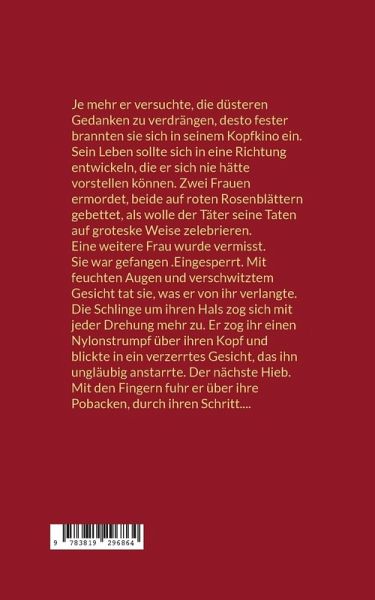 Je mehr er versuchte, die düsteren, dämonischen Gedanken zu verdrängen, desto fester brannten sie sich in sein Kopfkino ein. Sein Leben sollte sich in eine Richtung entwickeln, die er sich nie hätte vorstellen können. Die Illustrationen und Texte in dem Buch, das vor ihm lag, so anstößig und provozierend sie auch waren, schienen ihm Einblicke in seine verborgenen Sehnsüchte zu gewähren. Er wollte es real fühlen, erleben und erleiden. Da waren zwei Frauen, beide auf die gleiche Weise ermordet. Beide auf roten, künstlichen Rosenblättern gebettet, als wolle der Täter seine Taten auf groteske Weise zelebrieren. Eine weitere Frau wurde vermisst. Ihre Augen waren feucht und gerötet von den vielen Tränen. Sie war gefangen. Eingesperrt. Die Tage verschwammen zu einem endlosen Grau und diese Dunkelheit fraß sich durch ihre Seele. Mit feuchten Augen und völlig verschwitztem Gesicht tat sie, was er von ihr verlangte. Sie spürte und sah, wie es ihn erregte, berauschte. Sie war ihm ausgeliefert. Die Schlinge um ihren Hals zog sich mit jeder Drehung fester zu. Er zog ihr einen Nylonstrumpf über ihren Kopf und blickte in ein verzerrtes Gesicht, das ihn ungläubig anstarrte. Dann folgten die nächsten Peitschenhiebe. Die nächsten qualvollen Minuten für sein "Mädchen". Immer wieder fuhr er mit der Hand über ihre Pobacken, mit den Fingern durch ihren Schritt. Sie gehörte ihm. Jederzeit konnte er sie benutzen.
