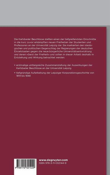 Die Karlsbader Beschlüsse stellten eine der tiefgreifendsten Einschnitte in die kurz zuvor erkämpften neuen Freiheiten der Studenten und Professoren an der Universität Leipzig dar. Sie markierten den ideologischen und politischen Gegenschlag der Regierungen der deutschen Einzelstaaten gegen die neue bürgerliche Universitätsentwicklung und deren "Geist der Freiheit" und sollen in dieser Arbeit deshalb in Entstehung und Wirkung betrachtet werden.