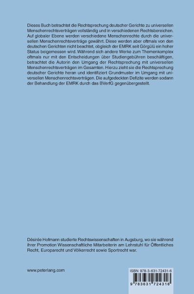 Dieses Buch betrachtet die Rechtsprechung deutscher Gerichte zu universellen Menschenrechtsverträgen vollständig und in verschiedenen Rechtsbereichen. Auf globaler Ebene werden verschiedene Menschenrechte durch die universellen Menschenrechtsverträge gewährt. Diese werden aber oftmals von den deutschen Gerichten nicht beachtet, obgleich der EMRK seit Görgülü ein hoher Status beigemessen wird. Während sich andere Werke zum Themenkomplex oftmals nur mit den Entscheidungen über Studiengebühren beschäftigen, betrachtet die Autorin den Umgang der Rechtsprechung mit universellen Menschenrechtsverträgen im Gesamten. Hierzu zieht sie die Rechtsprechung deutscher Gerichte heran und identifiziert Grundmuster im Umgang mit universellen Menschenrechtsverträgen. Die aufgedeckten Defizite werden sodann der Behandlung der EMRK durch das BVerfG gegenübergestellt.