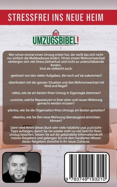 Wer schon einmal einen Umzug erlebt hat, der weiß das sich nicht nur einfach die Meldeadresse ändert. Hinter einem Wohnortwechsel verbergen sich viel Stress,Zeitverlust und nicht zu unterschätzende Kosten.Sind sie vielleicht auch:-gestresst von den vielen Aufgaben, die noch auf sie zukommen?-überfordert mit der ganzen Situation und den Wohnortwechsel mit Kind und Kegel? -ratlos, wie sie am besten Ihren Umzug in Eigenregie stemmen?-unsicher, welche Reparaturen in Ihrer alten und neuen Wohnung gemacht werden müssen? -planlos, wie Sie die Organisation Ihres Umzugs am besten gestalten? -ideenlos, wie Sie ihre neue Wohnung überzeugend einrichten können? Dann wird Ihnen dieses Buch sehr viele nützliche und praktische Tipps aufzeigen, damit Sie nie wieder mehr zu viel Geld für Ihren Umzug bezahlen. Setzen Sie auf die gebündelte Informationskraft meines Ratgebers und gelangen Sie mit dem fundierten Wissen dieses Ratgebers stressfrei in ihr neues Zuhause.