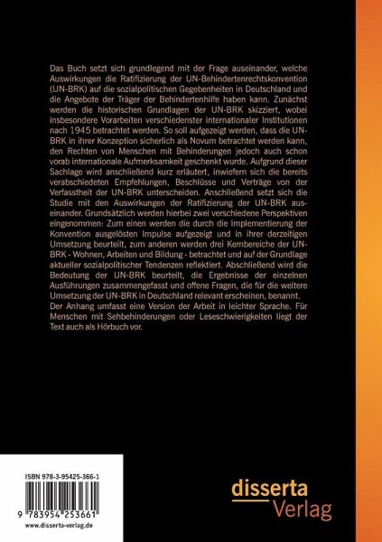 Das Buch setzt sich grundlegend mit der Frage auseinander, welche Auswirkungen die Ratifizierung der UN-Behindertenrechtskonvention (UN-BRK) auf die sozialpolitischen Gegebenheiten in Deutschland und die Angebote der Träger der Behindertenhilfe haben kann. Zunächst werden die historischen Grundlagen der UN-BRK skizziert, wobei insbesondere Vorarbeiten verschiedenster internationaler Institutionen nach 1945 betrachtet werden. So soll aufgezeigt werden, dass die UN-BRK in ihrer Konzeption sicherlich als Novum betrachtet werden kann, den Rechten von Menschen mit Behinderungen jedoch auch schon vorab internationale Aufmerksamkeit geschenkt wurde. Aufgrund dieser Sachlage wird anschließend kurz erläutert, inwiefern sich die bereits verabschiedeten Empfehlungen, Beschlüsse und Verträge von der Verfasstheit der UN-BRK unterscheiden. Anschließend setzt sich die Studie mit den Auswirkungen der Ratifizierung der UN-BRK auseinander. Grundsätzlich werden hierbei zwei verschiedene Perspektiven eingenommen: Zum einen werden die durch die Implementierung der Konvention ausgelösten Impulse aufgezeigt und in ihrer derzeitigen Umsetzung beurteilt, zum anderen werden drei Kernbereiche der UN-BRK - Wohnen, Arbeiten und Bildung - betrachtet und auf der Grundlage aktueller sozialpolitischer Tendenzen reflektiert. Abschließend wird die Bedeutung der UN-BRK beurteilt, die Ergebnisse der einzelnen Ausführungen zusammengefasst und offene Fragen, die für die weitere Umsetzung der UN-BRK in Deutschland relevant erscheinen, benannt.