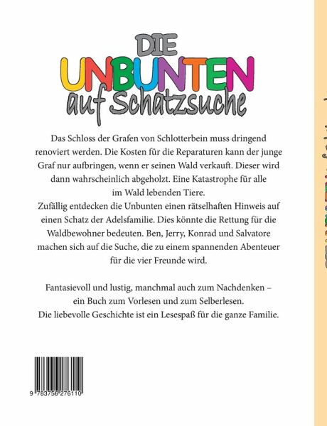 Das Schloss des Grafen von Schlotterbein muss dringend renoviert werden. Die Kosten für die Reparaturen kann der junge Graf nur aufbringen, wenn er seinen Wald verkauft. Dieser wird dann wahrscheinlich abgeholzt. Eine Katastrophe für alle im Wald lebenden Tiere. Zufällig entdecken die Unbunten einen rätselhaften Hinweis auf einen Schatz der Adelsfamilie. Dies könnte die Rettung für die Waldbewohner bedeuten. Ben, Jerry, Konrad und Salvatore machen sich auf die Suche, die zu einem spannenden Abenteuer für die vier Freunde wird. Fantasievoll und lustig, manchmal auch zum Nachdenken -ein Buch zum Vorlesen und zum Selberlesen. Die liebevolle Geschichte ist ein Lesespaß für die ganze Familie.