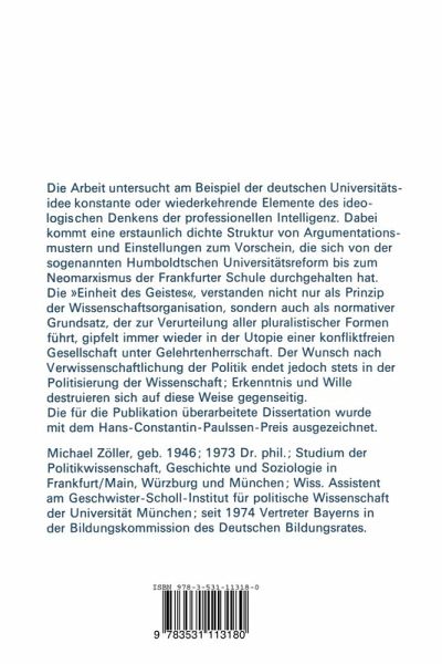 1. Vorbemerkung und Einleitung.- 1.1. Vorbemerkung.- 1.2. Einleitung.- 2. Die Entstehung der "klassischen Universitätsidee".- 2.1. Der aufgeklärte Absolutismus und die Universität der Aufklärungszeit.- 2.2. Die "klassische Universitätsidee" als Reaktion auf die Aufklärung.- 2.3. Wilhelm von Humboldt und die Gründung der Berliner Universität.- 2.4. Die Humboldtsche "Universitätsreform" als institutionelle Verewigung des Konflikts zwischen endogenen und exogenen Ansprüchen an die Hochschulen.- 3. Vorläufige Thesen zum historischen Stellenwert der "klassischen Universitätsidee".- 3.1. "Stabilisierung des Daseins . . . vom Bereich des Geistes her".- 3.2. Die Polarisierung von persönlicher Autonomie und politischer Souveränität.- 3.3. Die deutsche Sondersituation.- 3.4. Die "klassische Universitätsidee" als Reaktion auf den politischen und sozialen Strukturwandel.- 4. Exkurs: Kants Versuch einer dualistischen Verbindung von Politik und Moral.- 5. Wilhelm von Humboldt.- 5.1. Der Staat . . . "nichts, als ein Mittel . . . Bildung zu befördern".- 5.2. Die sozialen Implikationen der Humboldtschen "Bildung".- 5.3. Die Welt als affektiver Reiz.- 5.4. Arbeit und Entfremdung.- 6. Johann Gottlieb Fichte.- 6.1. Die "Überwindung" Kants.- 6.2. Die Suche nach der Einheit.- 7. Georg Wilhelm Friedrich Hegel.- 7.1. Die "Überwindung" der Gegensätze als "Versöhnung" von Notwendigkeit und Freiheit.- 7.2. Der neue Dualismus von Vernunft der Wirklichkeit und Zufälligkeit der Erscheinung.- 7.3. Hegels politische Ambivalenz.- 8 Der Begriff der Entfremdung.- 8.1. Fichtes und Humboldts Vorstellung von "Freiheit" als.- "Muße".- 8.2. Friedrich Schiller.- 9. Karl Marx.- 9.1. "Welcher Marxismus"?.- 9.2. Die "Überwindung"des Hegeischen Entfremdungsbegriffs.- 9.3. Arbeit, Arbeitsteilung und Entfremdung.- 9.4. Nicht Ökonomie statt Philosophie, sondern Ökonomie als Philosophie.- 9.5. Der ideologische Charakter des Entfremdungsbegriffs am Beispiel von Karl Marx.- 10. Ein Zwischenspiel (1850-1914).- 10.1. Die scheinbare Versöhnung mit der Wirklichkeit.- 10.2. Die Auflösung der scheinbaren Versöhnung mit der Wirklichkeit.- 11. "Die Herrschaft des Geistes" (Novemberrevolution und Aktivismus).- 11.1. Die "demokratische Kirche der Intelligenz".- 11.2. "Wer betrachtet, bewirkt nicht".- 11.3. "Links über den Parteien".- 11.4. "Politische Gleichberechtigung jedes mit jedem ... ein Axiom, das nur dazu dient, die Umwandlung der bestehenden Gesellschaftsordnung in eine vernünftige hinauszuzögern ..." ....- 11.5. "Orgiastische Hingabe an den Gegensatz alles dessen, was brauchbar und nutzbar ist".- 11.6. Die "Partei des Geistes".- 11.7. Die "sozialistische" Selbstinterpretation der Aktivisten als Grund für mangelnde Resonanz an den Hochschulen.- 12. Die hochschulpolitischen Fronten zur Zeit der Weimarer Republik.- 12.1. Die Forderung Max Webers.- 12.2. Die Reaktion auf Max Webers Forderung.- 12.3. Die Hochschulpolitik der neuen Regierung.- 12.4. Die demokratische Orientierung der Studentenschaft erweist sich als von kurzer Dauer.- 12.5. Politischer Führungsanspruch der Intelligenz und sozialistische Theoriediskussion.- 12.6. An den Hochschulen scheitert die Weimarer Demokratie schon in den Zwanziger Jahren.- 13. Die Entwicklung nach 1945.- 13.1. Die Restaurierung des alten Selbstverständnisses der Hochschulen.- 13.2. Die offiziöse Politik der Hochschulen in den ersten Nachkriegsjahren.- 13.3. Die Entwicklung innerhalb der Studentenschaft.- 13.4. DieEntstehung der studentischen Neuen Linken.- 14. Die "kritische Theorie".- 14.1. Adorno und Horkheimer.- 14.2. Marcuse.- 14.3. Habermas.- 14.4. Resignation, Erziehungsdiktatur oder Ersatzwirklichkeit - Die "kritische Theorie" als Gefangene ihrer eigenen Argumentationsfigur.- 15. "Kritische Theorie" und studentische Neue Linke.- 15.1. Studentenschaft als Ersatzproletariat und Hochschule als Ersatzgesellschaft.- 15.2. "Demokratisierung der Hochschulen" und "politisches Mandat" als Folgen der theoretischen Aporie.- 15.3. Das Unpolitische an der "Politisierung" der Wissenschaft.- 15.4. Das orthodoxe Ende der antiautoritären Bewegung.- 16. Fortentwicklung der Verfassung - oder Entwicklung fort von der Verfassung?.- 16.1. Ersatzlegitimation nach dem Vorbild Marcuses.- 16.2. Dezisionismus der Wissenschaft statt Dezisionismus der Politik.- 16.3. Die Kombination geschützter Freiräume mit der Hoffnung auf bewußtseinsändernde Folgen von Strukturreformen in Anlehnung an Habermas.- 16.4. Die vermeintliche "Überwindung" der Politik durch normative Verallgemeinerung der soziologischen Kennzeichen intellektueller Existenzweisen.- 17. Anmerkungen und Zitatnachweise.- 18. Literaturverzeichnis.- 19. Register.- 19.1. Namensregister.- 19.2. Sachregister.
